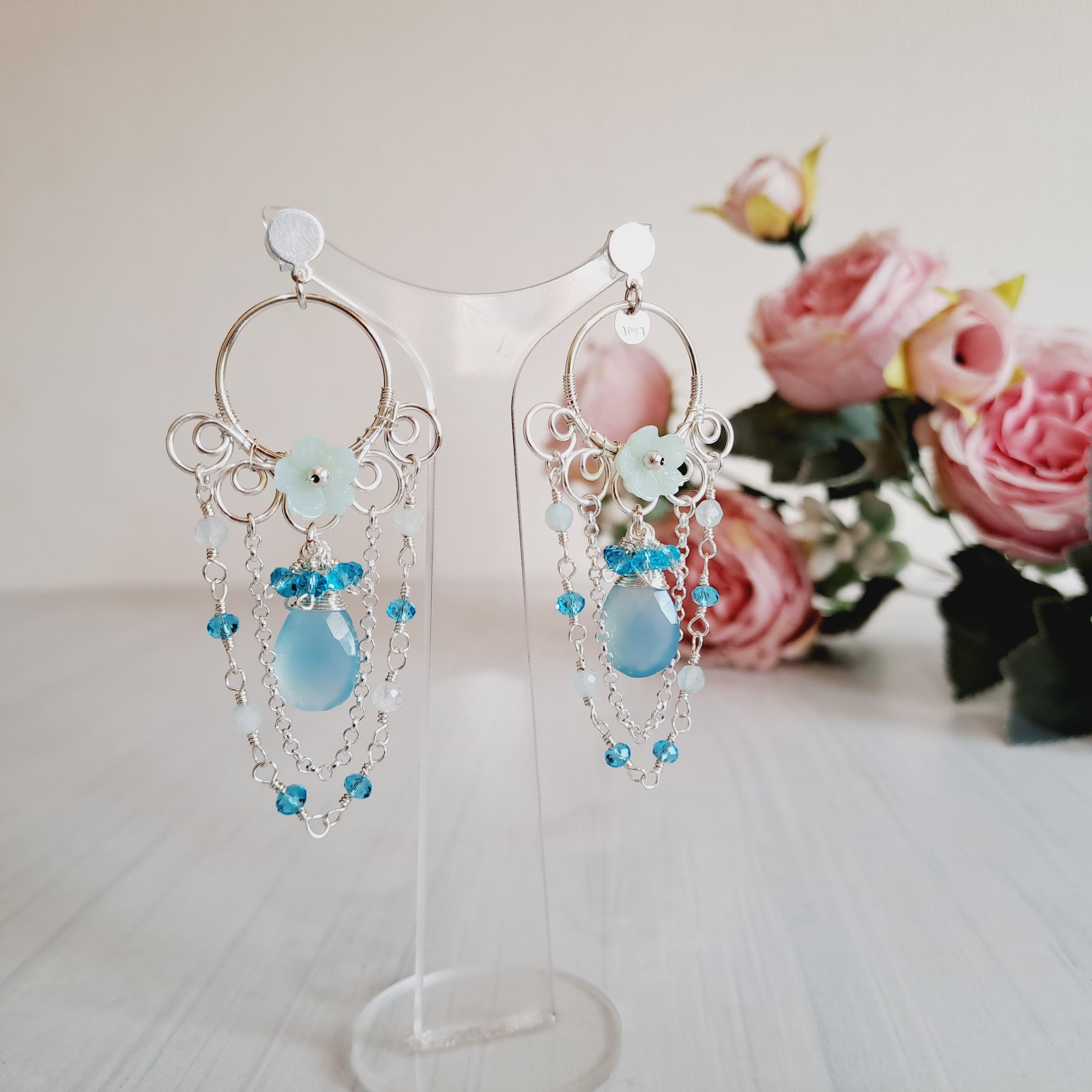 Aros tejidos en alambrismo con filigrama, tejido en calcedonia celeste, cristal turquesa flor de acrílico, gota de calcedonia azul, cadena y base en baño de oro de 18k.