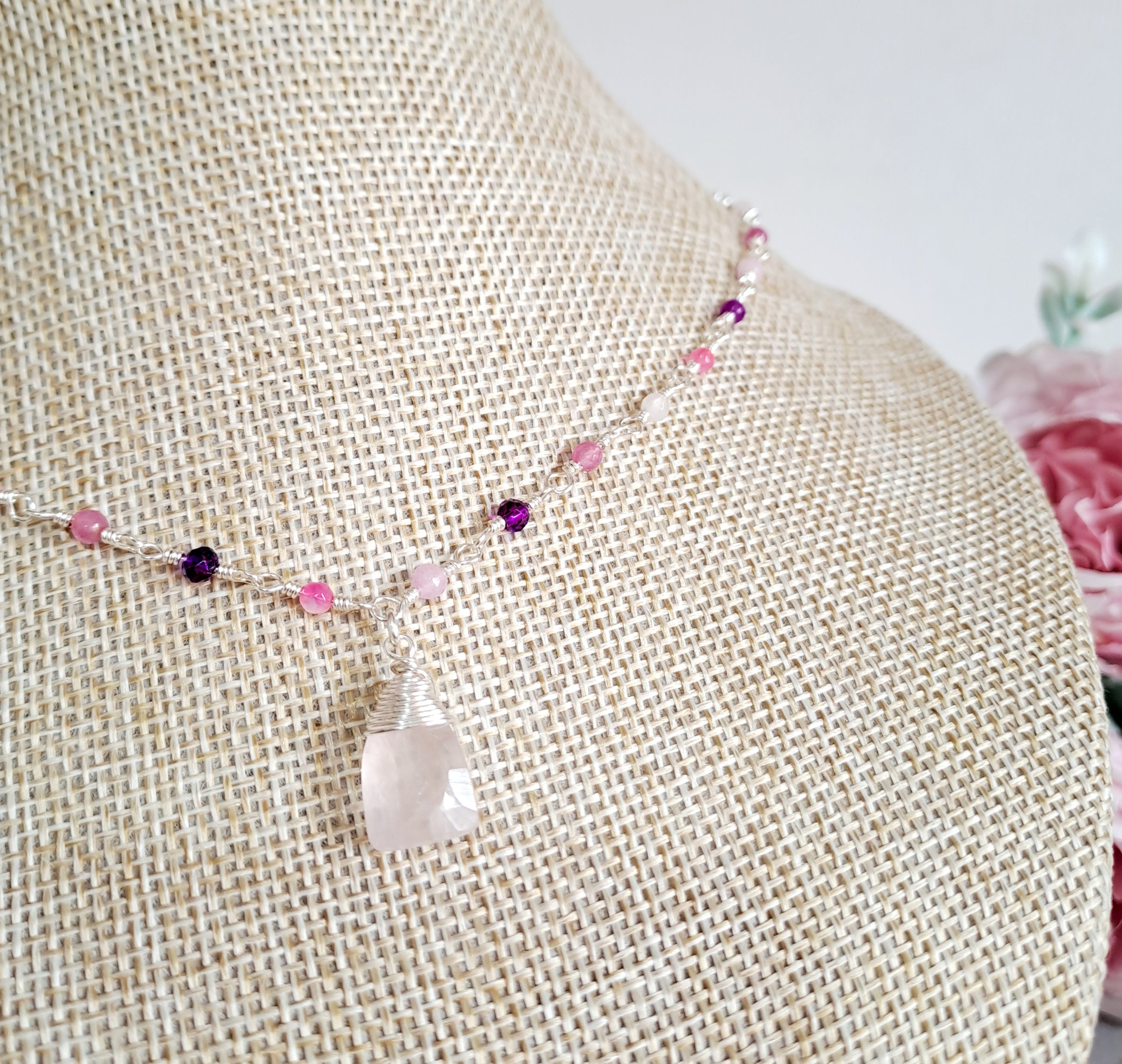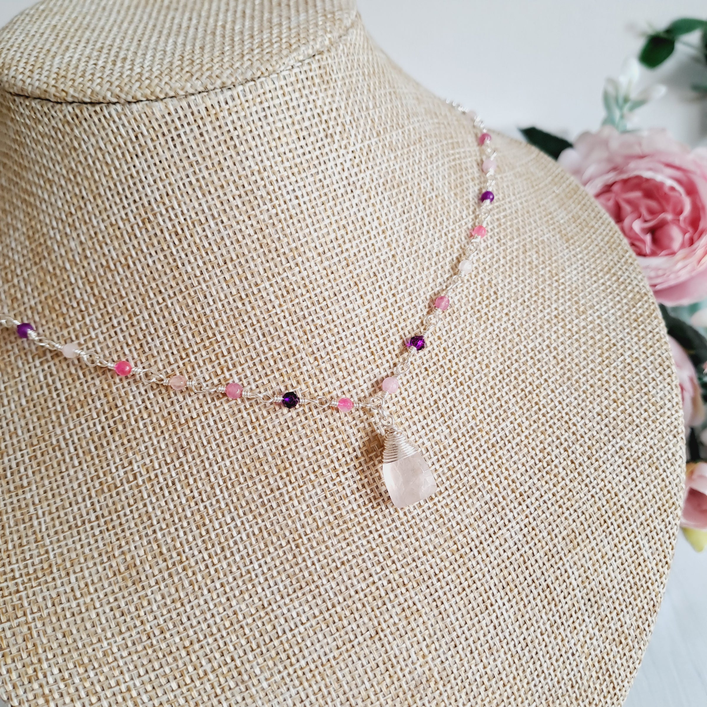 Collar tejido en mix de piedras y cristales, con maxi gota de cuarzo rosa. Enchapado en plata 950.